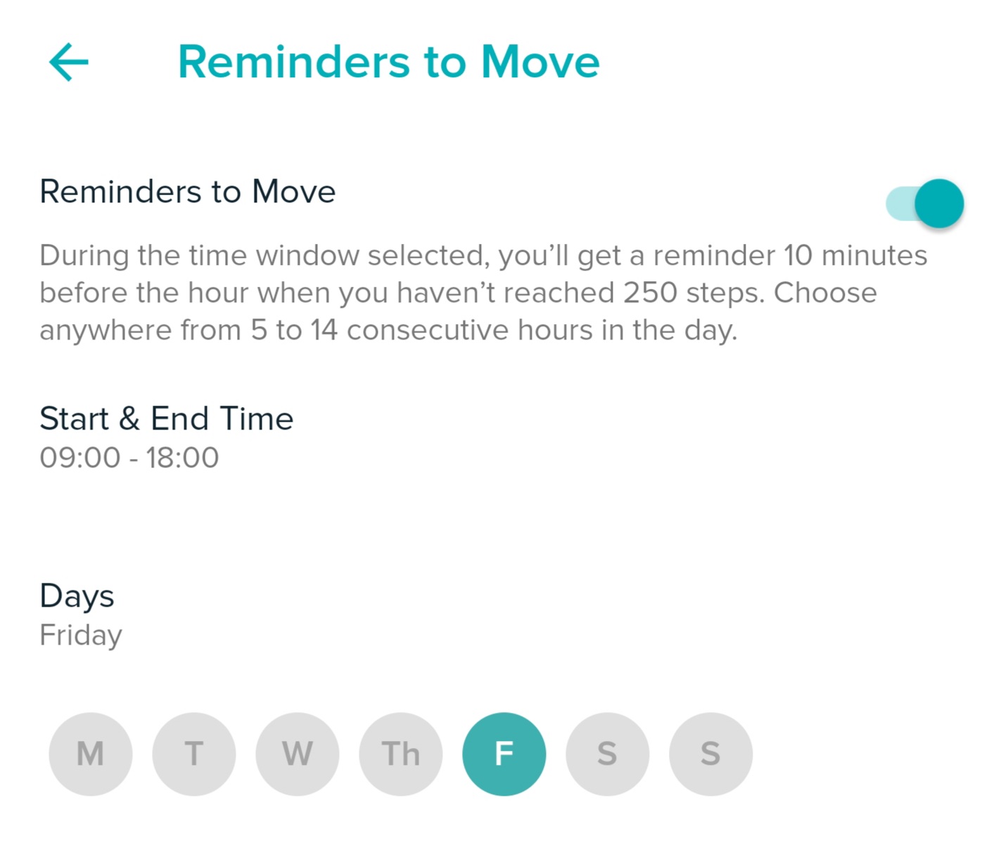 - A maximum of 23, day Move hours can be defined and recorded [the Fitbit App can only record 14]
